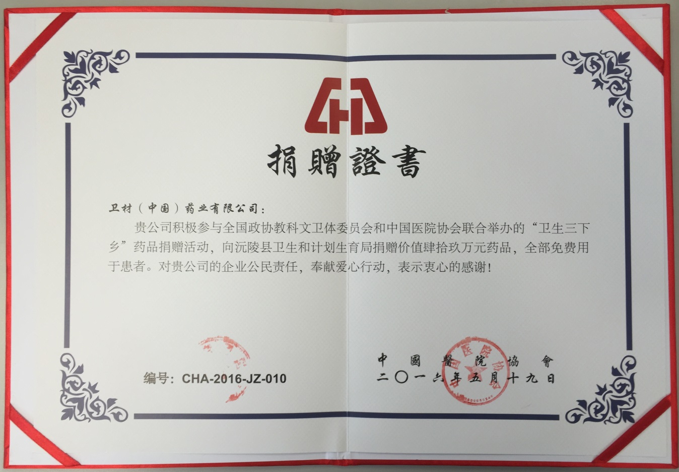 2016年5月19日,衛(wèi)材(中國(guó))藥業(yè)有限公司(以下簡(jiǎn)稱:衛(wèi)材(中國(guó)))受邀參加由全國(guó)政協(xié)教科文衛(wèi)體委員會(huì)和中國(guó)醫(yī)院協(xié)會(huì)在湖南省懷化市沅陵縣舉辦的“衛(wèi)生三下鄉(xiāng)”活動(dòng),并向本次活動(dòng)捐贈(zèng)價(jià)值約50萬(wàn)元的藥品,用于當(dāng)?shù)蒯t(yī)院的醫(yī)療健康使用。據(jù)統(tǒng)計(jì),衛(wèi)材(中國(guó))一直秉承hhc(human health care 關(guān)心人類健康)精神,踐行企業(yè)責(zé)任,在2014年和2015年通過(guò)“衛(wèi)生三下鄉(xiāng)”活動(dòng)曾分別捐贈(zèng)價(jià)值45萬(wàn)和49萬(wàn)元的藥品。