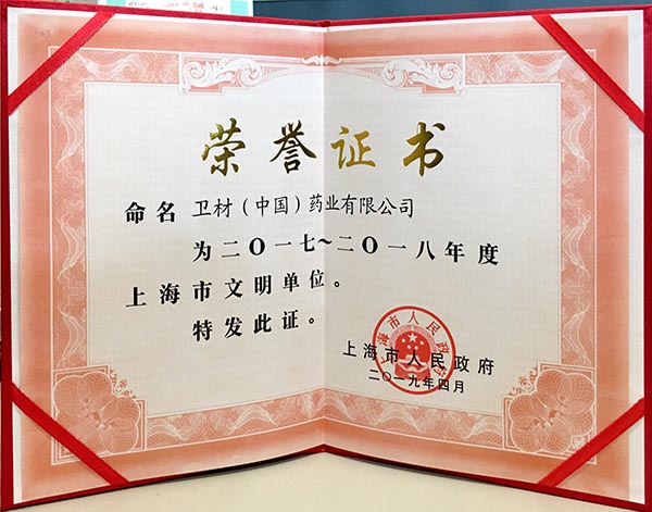 衛(wèi)材中國(guó)榮獲2017-2018年度上海市文明單位。