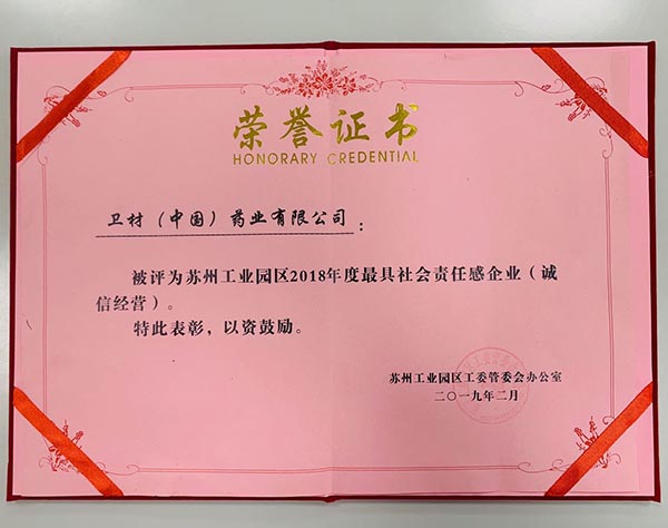 衛(wèi)材中國(guó)榮獲蘇州工業(yè)園區(qū)2018年度最具社會(huì)責(zé)任感企業(yè)(誠(chéng)信經(jīng)營(yíng))。