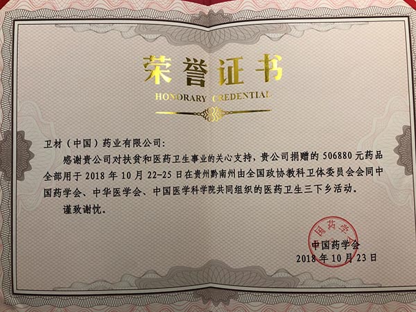 “衛(wèi)生三下鄉(xiāng)”藥品捐贈(zèng)證書。