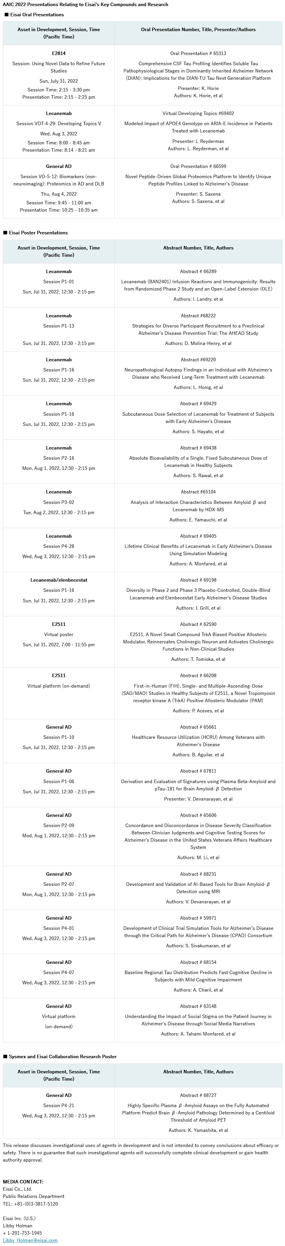 衛(wèi)材將在2022年阿爾茨海默病協(xié)會國際會議(AAIC)上展示包括ARIA-E和皮下給藥方面的lecanemab最新數(shù)據(jù)以及其它阿爾茨海默病研究