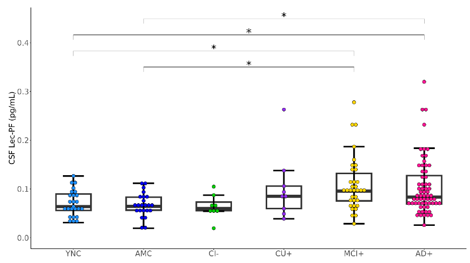 AD引起的輕度認(rèn)知障礙或癡呆患者(圖1中的MCI+、AD+組)的Lec PF CSF濃度明顯高于認(rèn)知功能正常的患者(圖中的YNC和AMC組)。