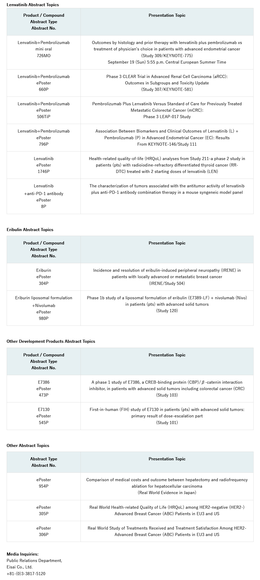 At this congress, differences in outcomes by histology and prior therapy in the pivotal Phase 3 Study 309/KEYNOTE-775 trial, which compared the combination therapy of lenvatinib plus pembrolizumab (product name: KEYTRUDA?), the anti-PD-1 therapy from Merck & Co., Inc., Kenilworth, N.J., U.S.A. (known as MSD outside the United States and Canada),?with TPC (Treatment of Physician’s Choice) in patients with advanced endometrial cancer, following at least one prior platinum-based regimen, will be presented as an oral presentation (Abstract No: 726MO). In addition, a subgroup analysis and safety update from the pivotal Phase 3 CLEAR study (Study 307/KEYNOTE-581), which compared the combination of?lenvatinib plus pembrolizumab versus sunitinib for the first-line treatment of patients with advanced renal cell carcinoma (RCC) will be presented as an e-poster presentation (Abstract No: 660P). Additionally, e-poster presentations will be given on the outcomes of early clinical studies on a liposomal formulation of eribulin plus nivolumab (Abstract No: 980P), a CREB-binding protein (CBP)/β-catenin interaction inhibitor E7386 (Abstract No: 473P) and a compound derived from total synthesis of halichondrin, E7130 (Abstract No: 545P).